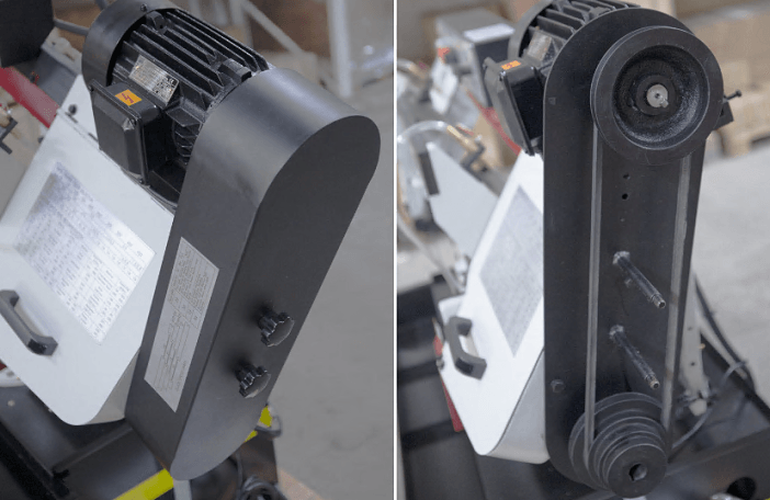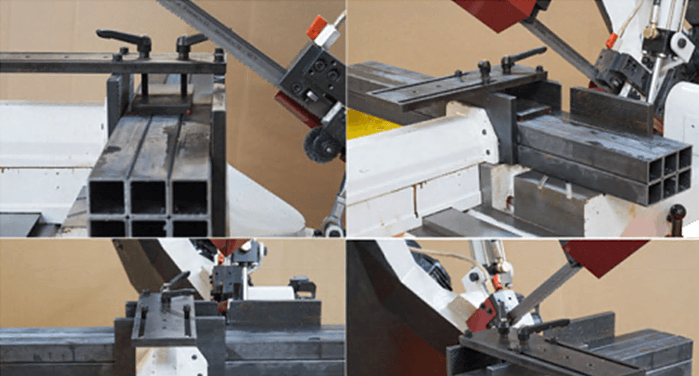 В рабочей зоне резания полотно точно ведется двумя направляющими головками. Станок имеет неподвижные тиски и поворотный механизм рамы, для пиления под углом необходимо изменить положение рамы относительно неподвижных тисков. Высота полотна 27мм позволяет пилить c высокой точностью и параллельностью полые и профильные заготовки под различными углами, в том числе и сплошные заготовки.