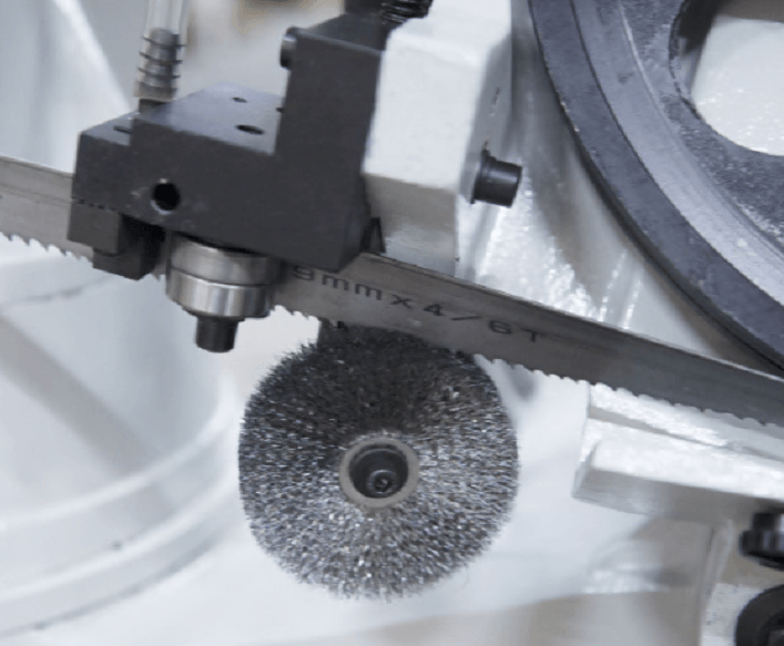Механическая дисковая щётка (приводимая в движение от движения полотна). Зубчатый блок, с твёрдосплавными платинами и подшипниками для выпрямления полотна в зоне резания и качественной фиксации для стабильного пиления. |