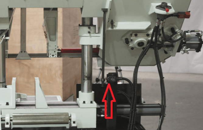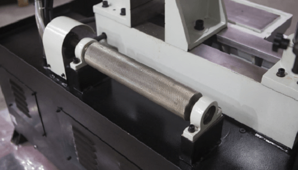 - Вспомогательный стол с роликом подачи приводится в движение вращением ручки маховика с передней части станка.